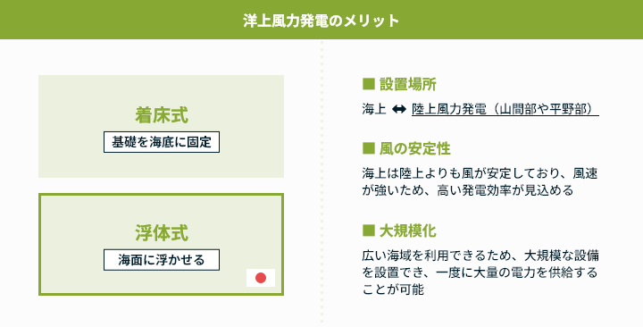 洋上風力発電は、さらに基礎を海底に固定する着床式と、海面に浮かせる浮体式の二つの方式がとられ、日本のような遠浅の海が少ない国では、浮体式技術の開発に大きな期待が寄せられています。